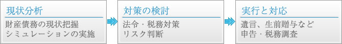 そこで民法や税法など法律的な問題整理を行い、時機をとらえた対策の実行を決めることが不可欠です。権利関係については必要に応じ法律の専門家を交え、後々の相続争いを避けるよう対処します。また実際の不動産や株式など資産移転に関する有効な税務対策を事前に検討します。