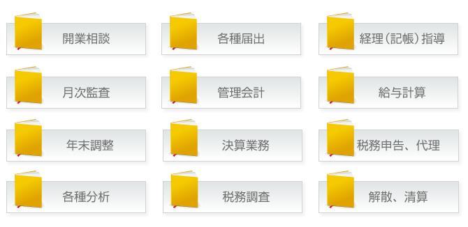 ※その他各種届出書の作成、提出、税務調査の立会い、税務相談などにも対応いたします。